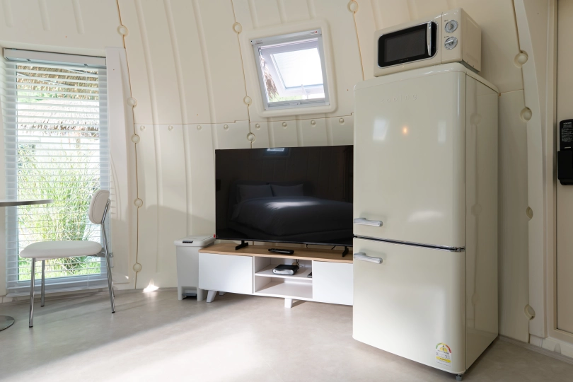 - 2인 퀸 사이즈 침대, 3~4인 1인당 1000*2000 3단 접이식 토퍼, 샤워부스, 50인치 tv, 인덕션, 싱크대, 주방용품, 냉장고, 에어컨, 소화기, 드라이기, 정수기, 전자렌지, 무료와이파이, 바베큐 및 자쿠지 텐트, 개별 불멍 화로, 대형 썬베드 및 파라솔 ※칫솔, 치약,비누 필수지참